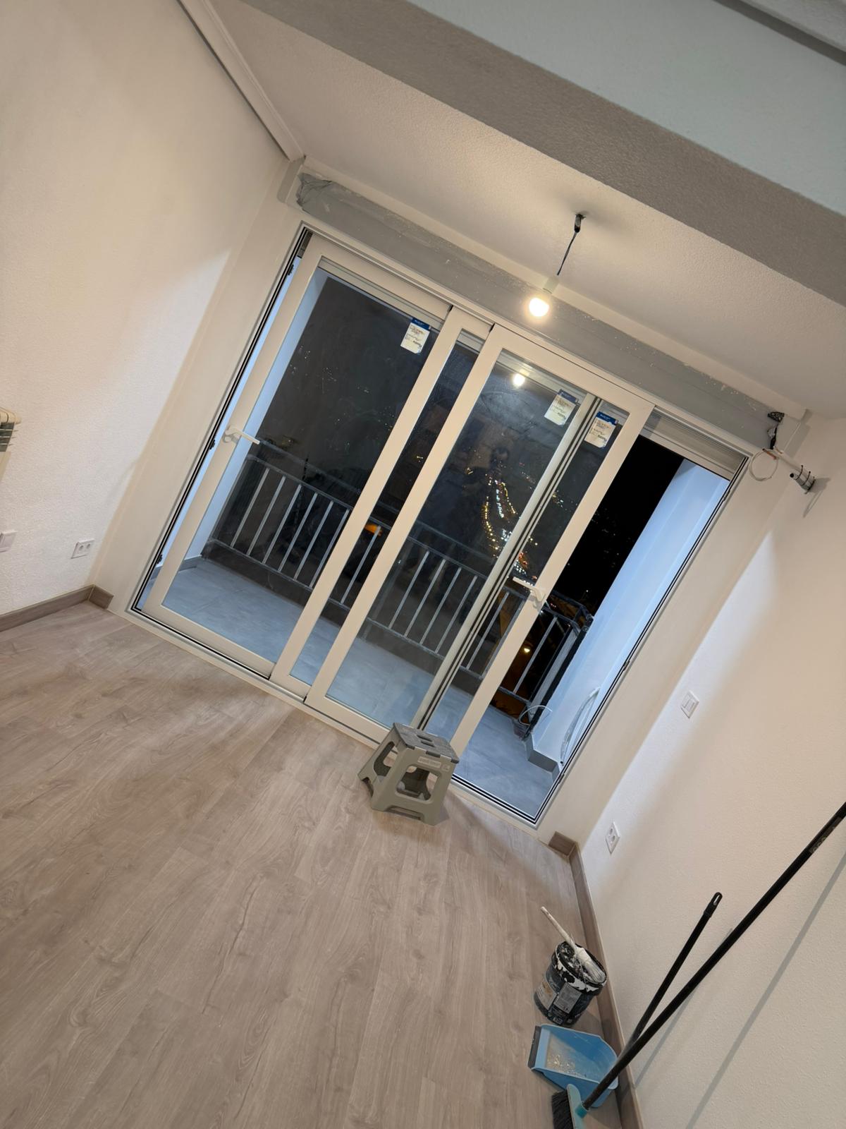 Nivelación del soporte, manta aislante y colocación de laminado imitación roble con rodapié.
